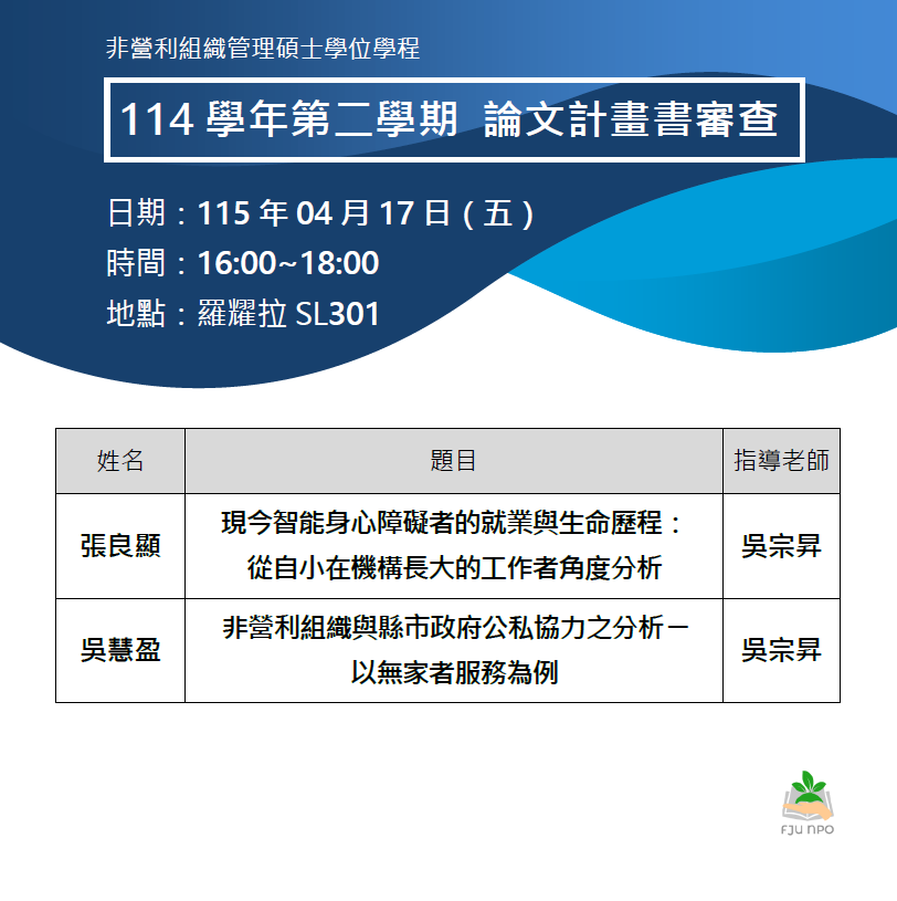 論文|114學年度第2學期 論文計畫書審查口試公告(二)
